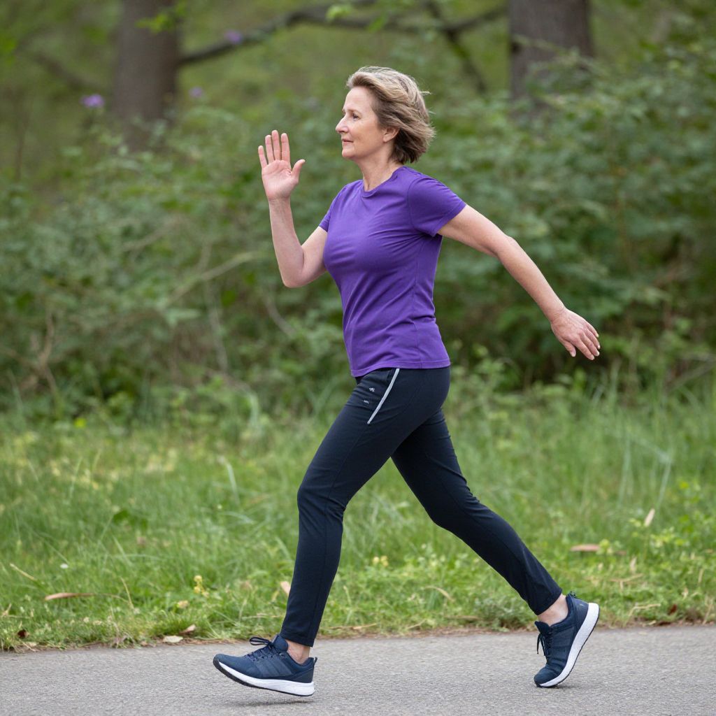 Embracing the rhythm of life, a mature woman finds freedom and joy in the symphony of her steps and the gentle hum of nature as she exercises outdoors, her spirit soaring with each beat.