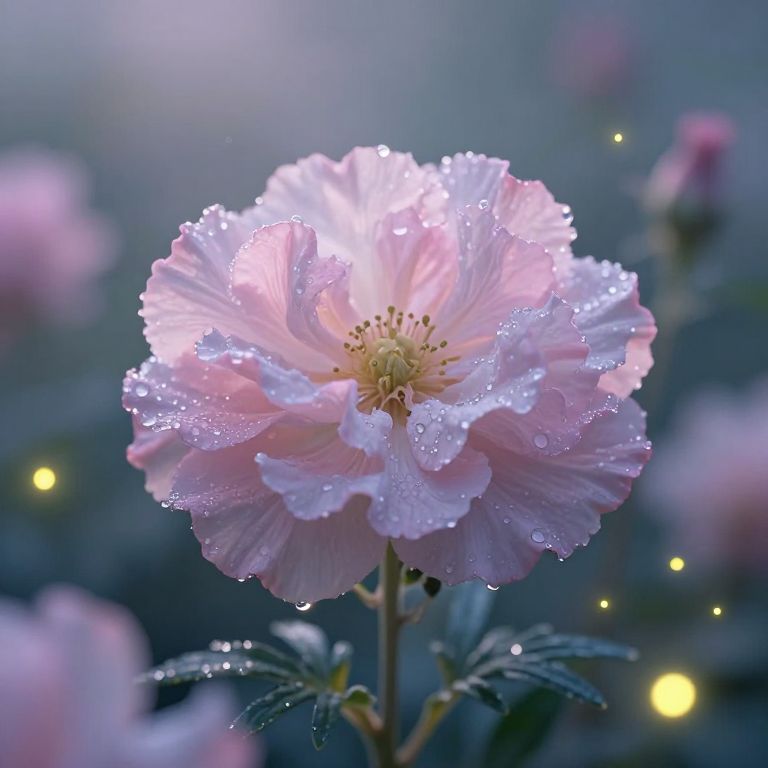 Lote flower blooming in a mystical garden at dawn, soft pastel colors, dewy petals, delicate and ethereal atmosphere, intricate details of the plant surrounded by glowing fireflies, dreamy and serene mood, ultra-realistic style.