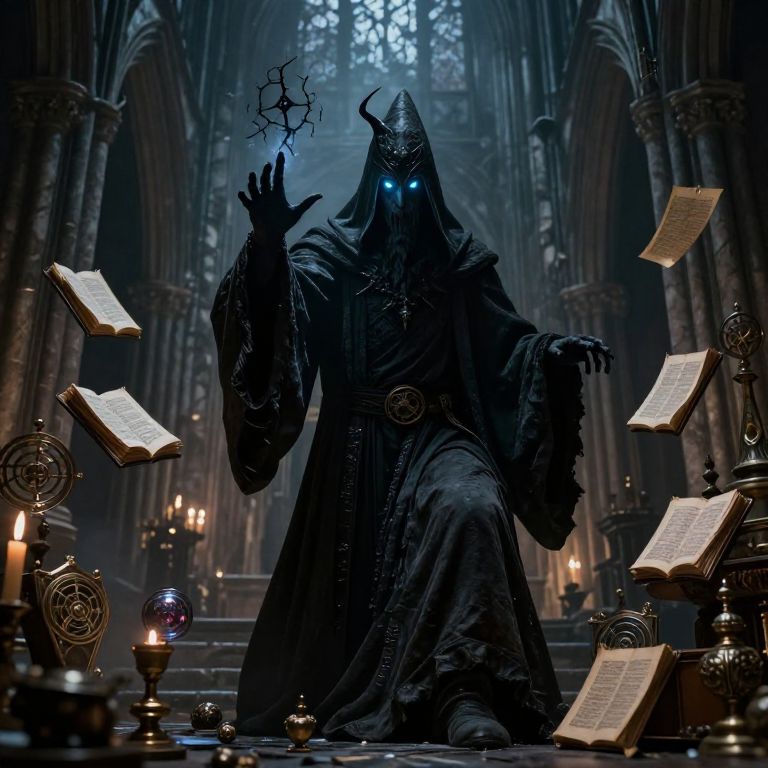 Dark sorcerer art, ancient wizard with glowing eyes casting a dark spell in a ruined gothic cathedral, surrounded by arcane artifacts and floating spellbooks, dramatic chiaroscuro lighting, dark fantasy theme, richly detailed environment