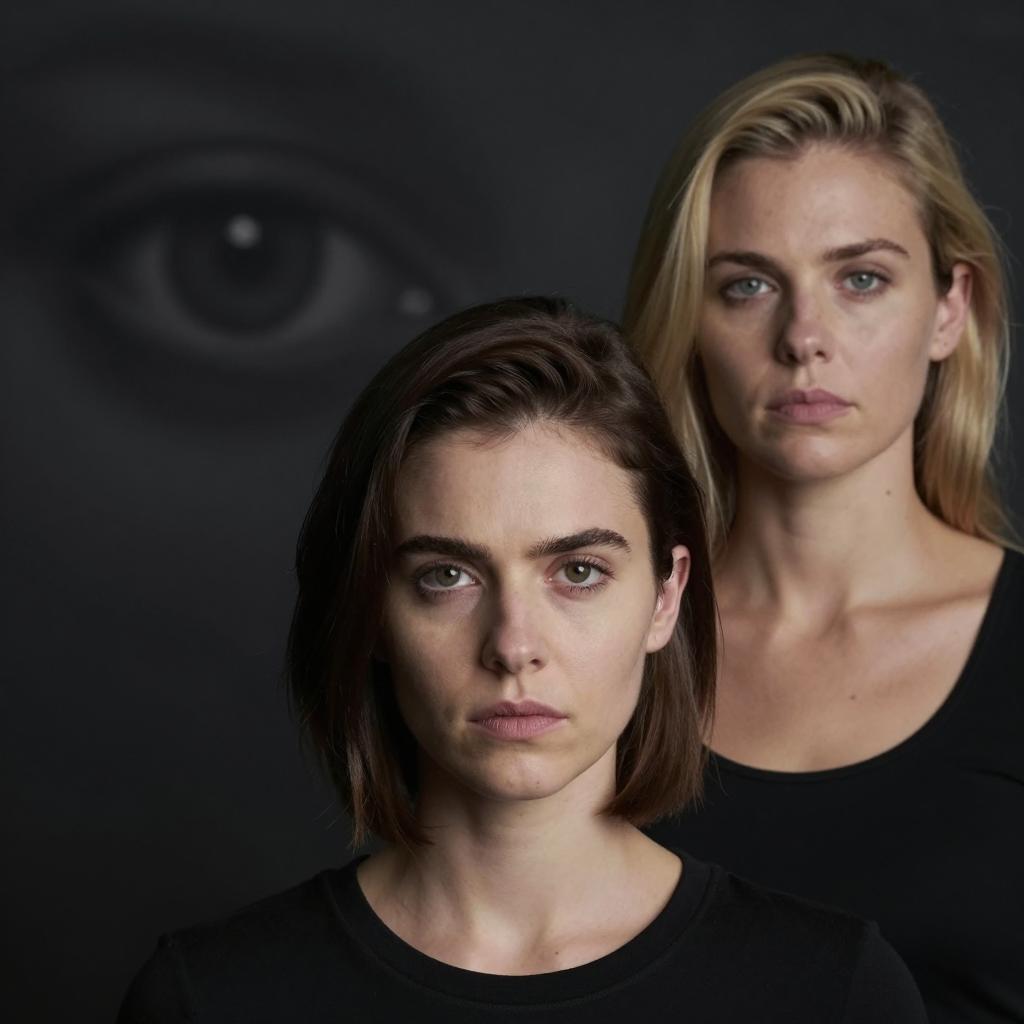 Photograph of six people against a dark background. Left: large white mask with a black eye hole. Right: five individuals, front and back, serious expressions. Top right: bald black man, medium build. Top center: white woman with short blonde hair. Bottom right: white woman with wavy blonde hair, wearing a strapless top. Bottom center: white man with short brown hair, intense gaze. Background dark, people illuminated.