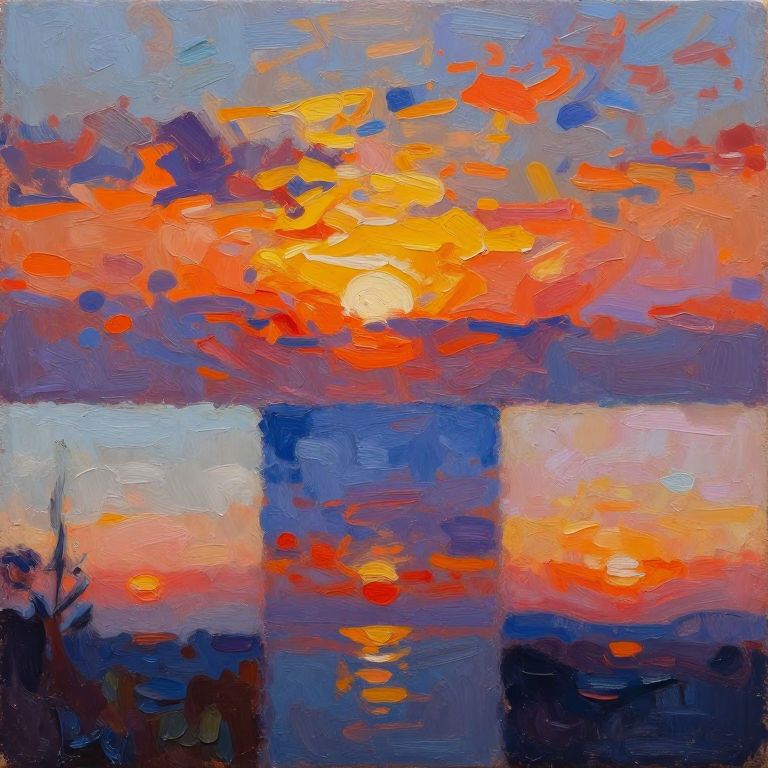Impressionist-style painting of a vibrant sunset with bold orange, red, and yellow hues, reflected in a blue water surface.
