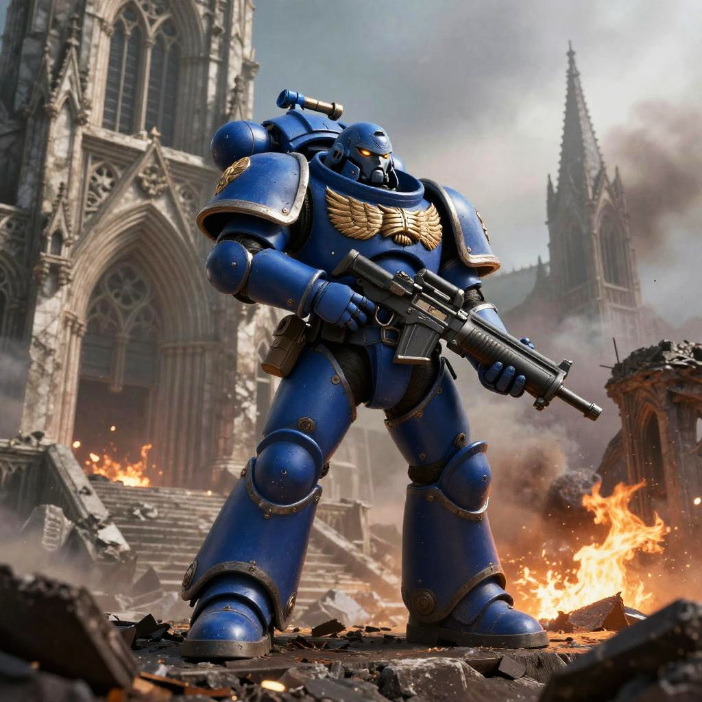 Warhammer 40k Ultramarines art, towering Space Marine commander in iconic blue power armor, holding a bolter rifle, standing on a ruined cathedral steps, war-torn sky with smoke and fire, high-detail sci-fi gothic architecture, heroic and imposing atmosphere.