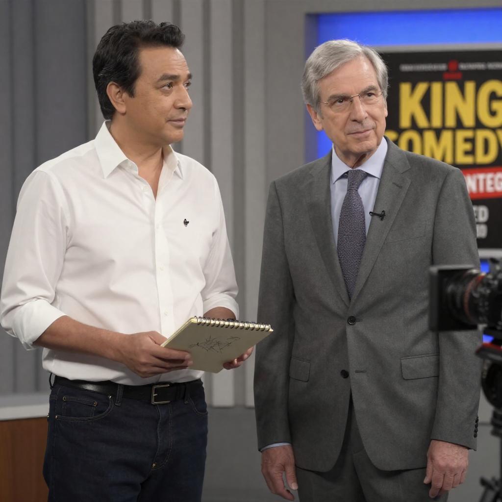 Photograph of two men in a studio. One man, with dark hair, wears a white shirt and holds a sketchbook, standing to the left. The other, with gray hair, wears a gray suit and patterned tie, stands to the right. Background includes vertical blinds, a microphone, and a camera. "KING OF COMEDY" poster is visible.