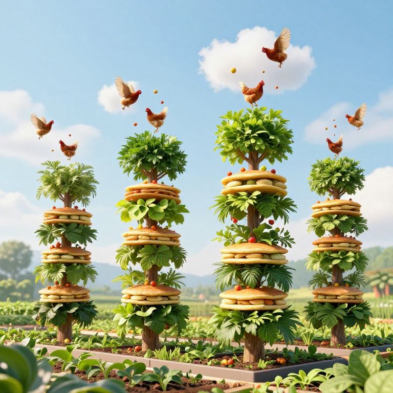 A floating farm carpeted in floating crops grows vertical trees stacked like pancakes, with flying chickens pecking at clouds of falling fruit.