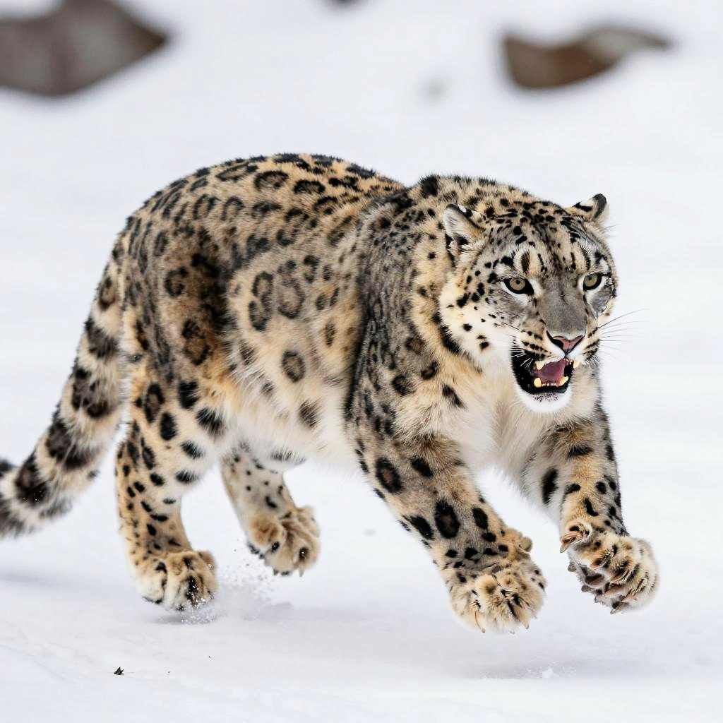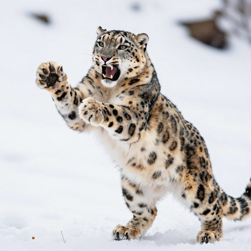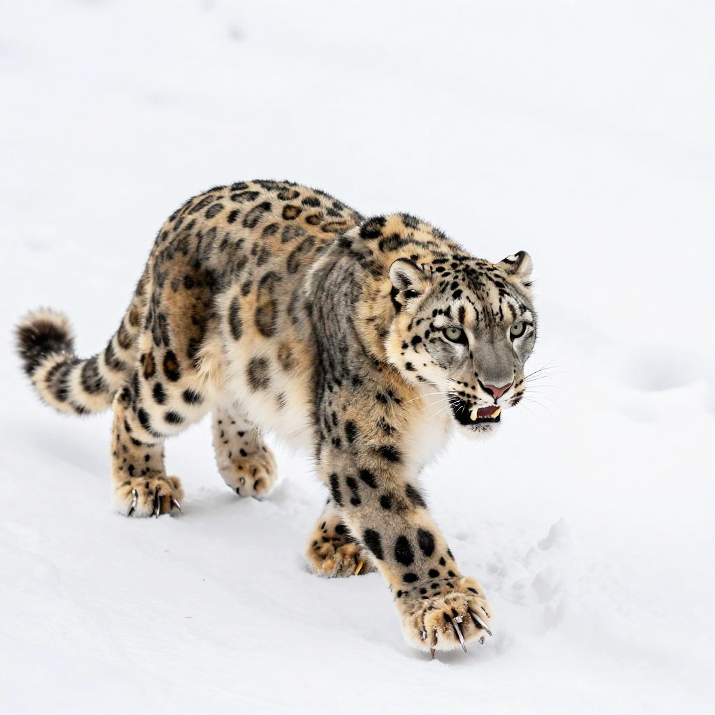 Dynamic scene of a snow leopard in a crouching low with teeth bared, featuring an aggressive expression, detailed visible claws, and intricately textured fur for a lifelike depiction.