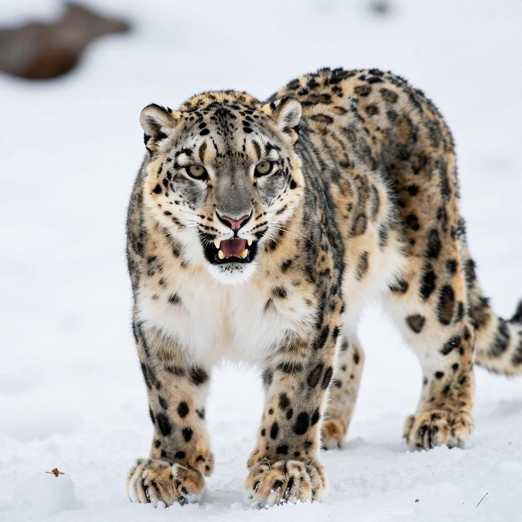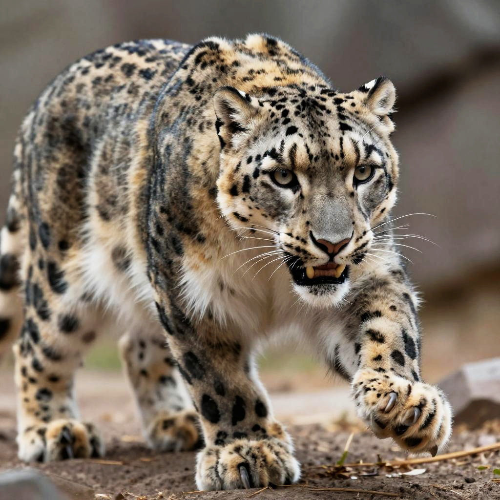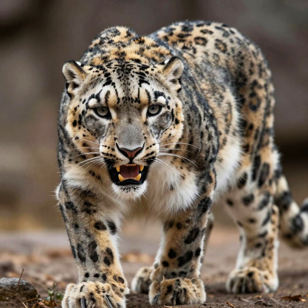 Photograph of a fierce snow leopard with a powerful, muscular build, walking towards the camera with its mouth slightly open, revealing sharp teeth. Its fur is golden-yellow with black rosettes and spots, and a white underbelly. The background is blurred, featuring earthy brown tones, suggesting a rocky or forested habitat. The leopard's intense, focused eyes and forward-leaning posture convey alertness and aggression. The texture of its fur appears dense and thick, suitable for a cold climate. The image is sharply focused on the leopard, highlighting its detailed pattern and muscular structure.