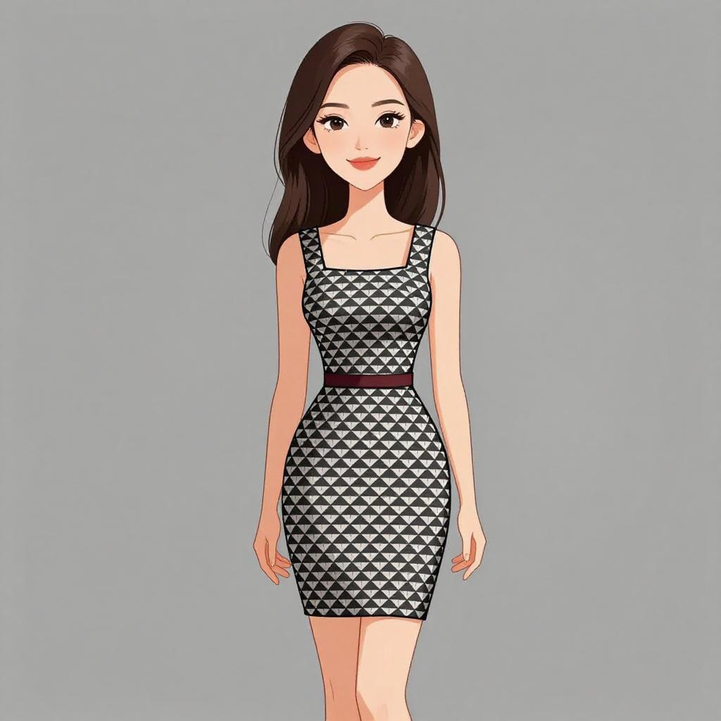 Woman with pretty face and pretty hair. smiling Woman, geometric print mini dress in monochrome palette, square neckline, sleeveless, fit and flare silhouette, thin burgundy belt at the waist, above-knee hem, straight hair. --sref 1467