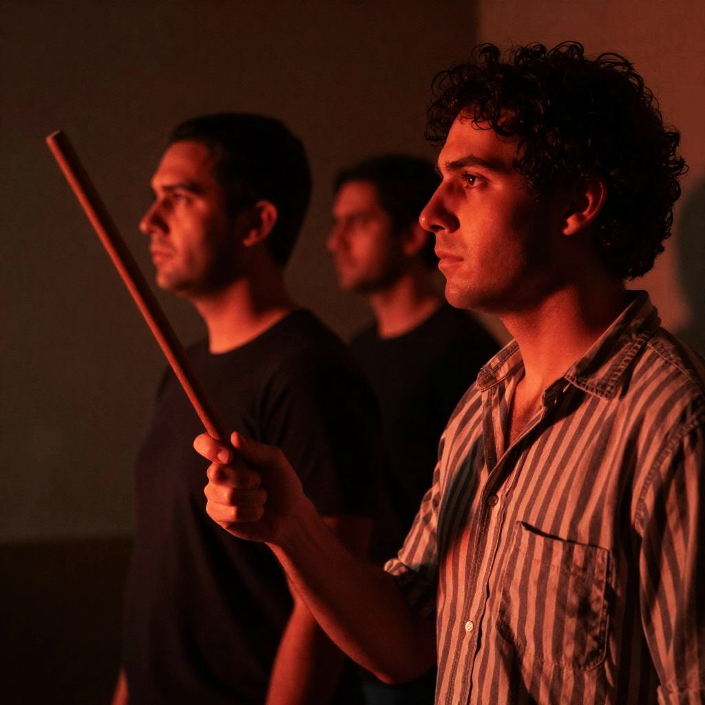 Two Men in Blue Military-Style Uniforms Squatting in Costume Shop