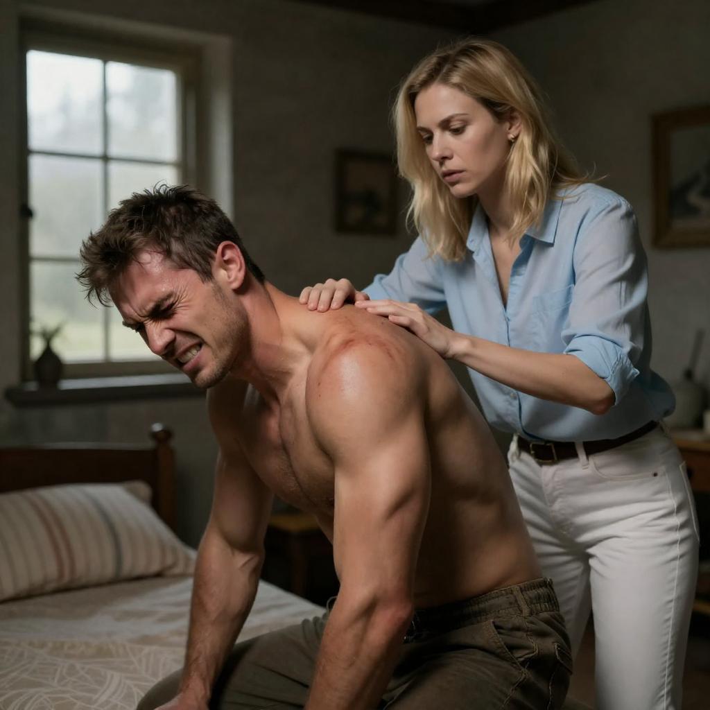 Photograph of a woman with long brown hair, wearing a white tank top, pinning a man with short brown hair, wearing a gray shirt and jeans, on the ground. She has her hands on his chest, his face shows intense pain. Background includes wooden panels and metal bars.