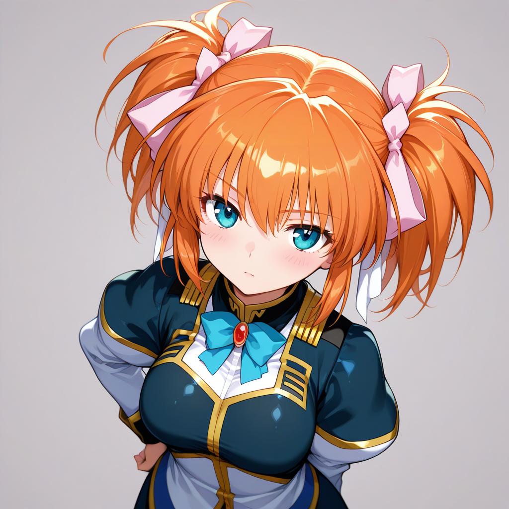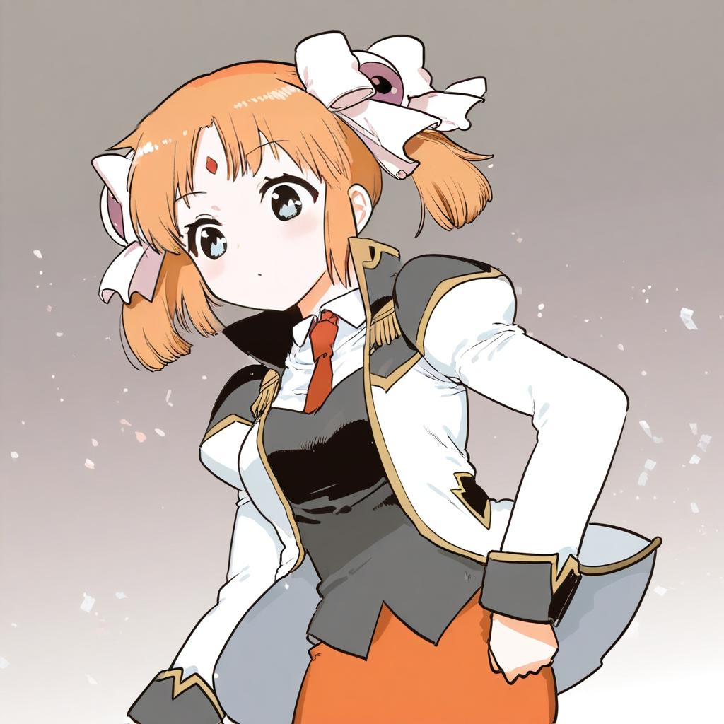 Apricot sakuraba, galaxy angel rune, 1girl, orange hair, short twintails, twintails, uniform, ribbon, long sleeves, by artist aramori susumu, illustrious