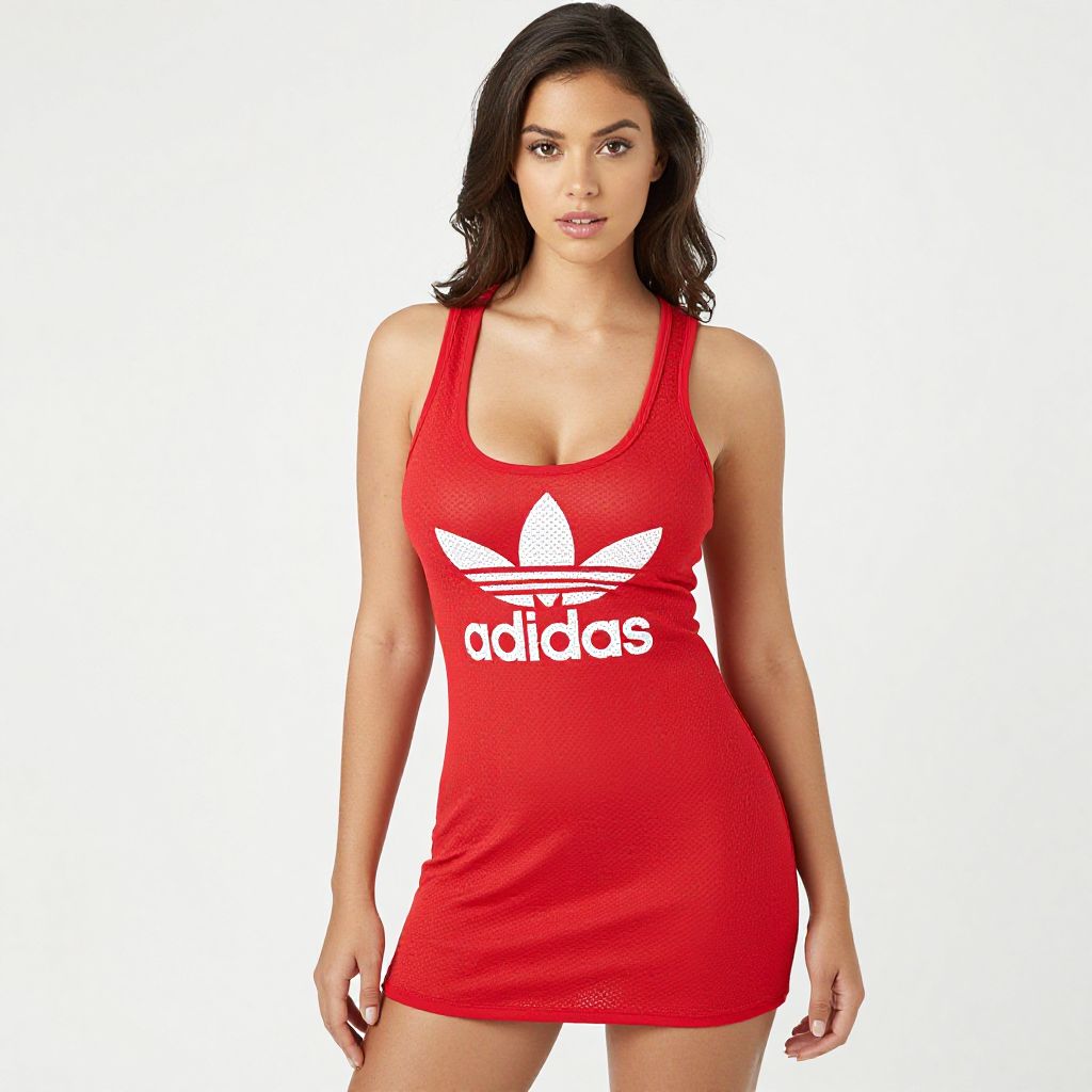 Photograph of a brunette woman with medium skin tone, wearing a tight, red Adidas tank dress with white logo, standing against a white background, looking