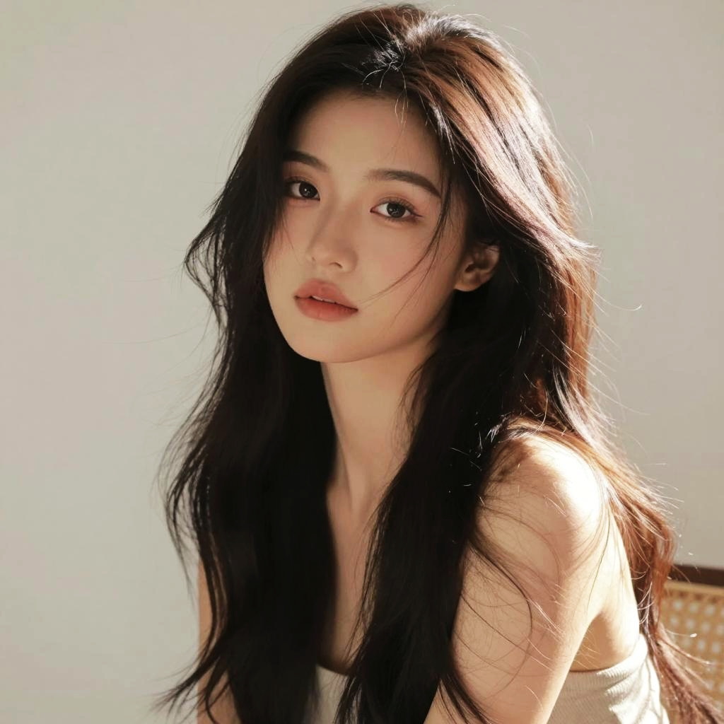 High-resolution portrait of a young Asian woman with long dark hair and smooth skin standing outdoors. She wears a white sleeveless top with thin straps, looking directly into the camera with a neutral expression. The background is softly blurred, highlighting her face with natural lighting.