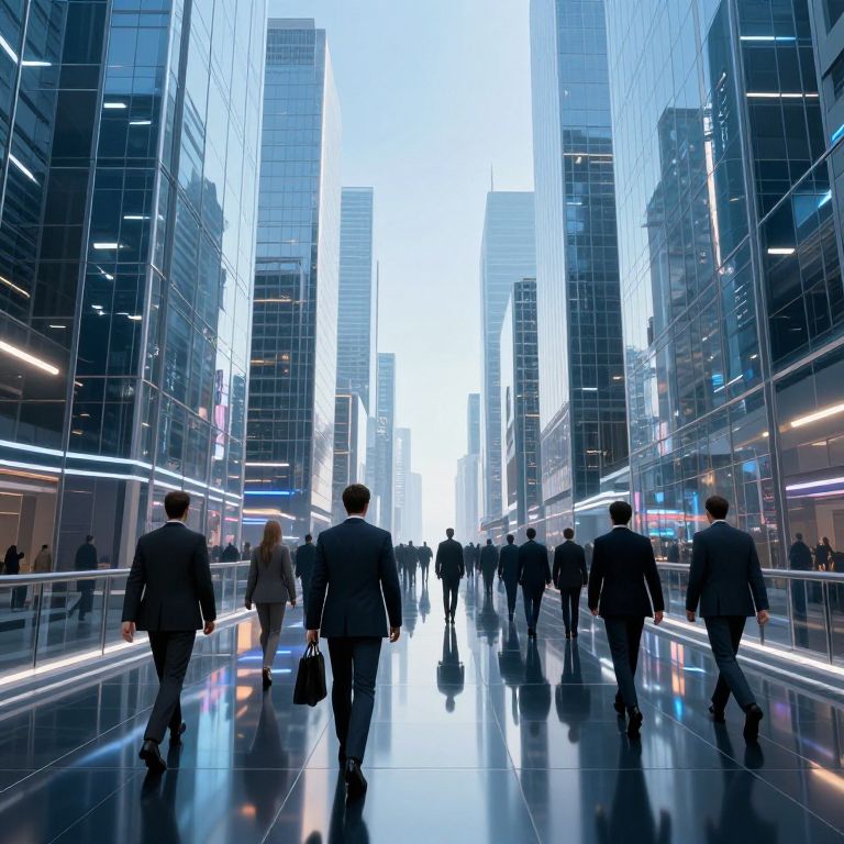Photograph of a modern, glass-walled cityscape at dusk, showing numerous business professionals walking down a glossy, reflective pedestrian walkway between towering skys