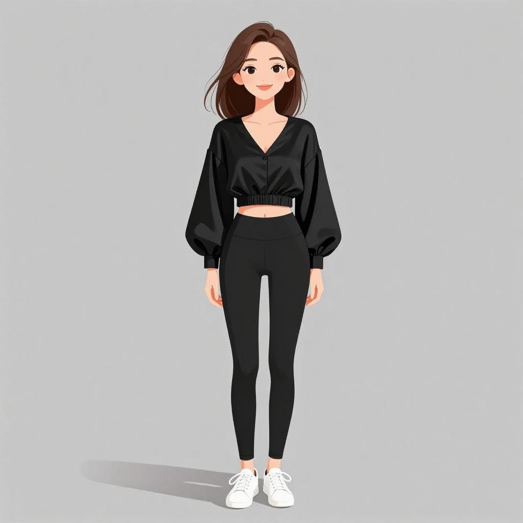 Woman with pretty face and pretty hair. smiling Woman, contemporary casual, black cropped satin blouse with long puffed sleeves, gathered elastic hem, high-rise black leggings, white lace-up sneakers, studio background --sref 1467