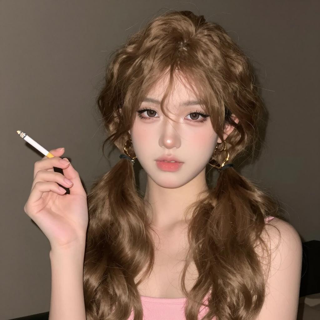 Young woman with light brown, wavy hair in pigtails, wearing gold earrings and a pink top, holding a lit cigarette in her right hand. She has heavy black eyeliner, light pink lipstick, and a neutral facial expression. Background is a plain, dark brown wall. Her hair is slightly disheveled.