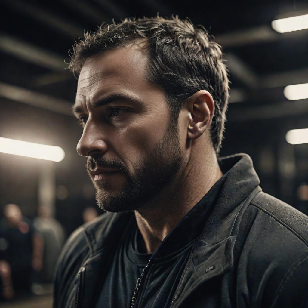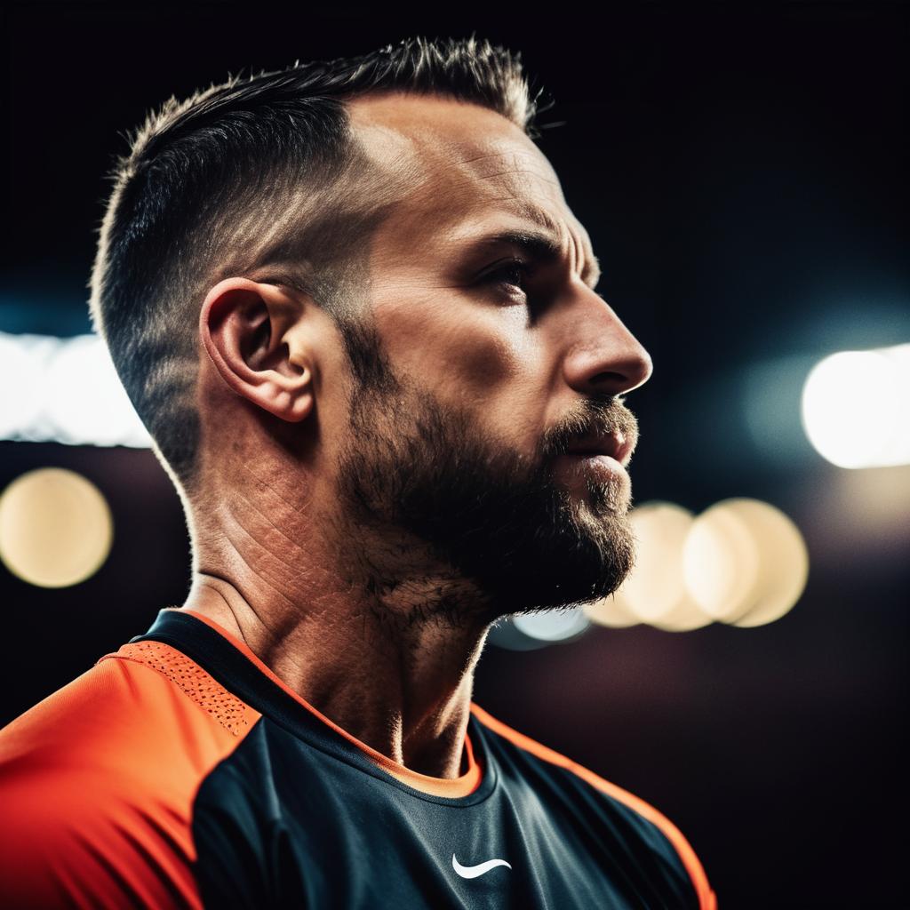 Realistic portrait of a rugged man, posed in a profile view, wearing sportswear, with expressive lighting that emphasizes his features and adds depth. Shot on iPhone camera.