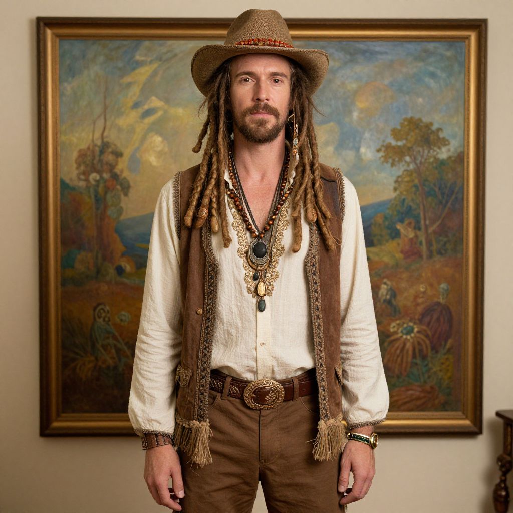 "Woodstock Hippie Outfit, man with dreadlocks and a hat standing in front of a painting"