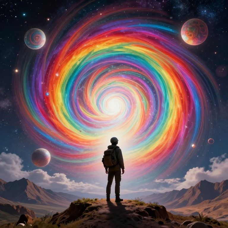In this vibrant and surreal scene, a solitary figure stands at the center, gazing into a cosmic portal that opens up before them. The portal is a swirling vortex of rainbow hues, with layers of colors blending seamlessly into one another, creating a mesmerizing effect. Surrounding the portal are floating orbs and intricate patterns, adding depth and complexity to the composition. The figure, wearing a helmet and a backpack, appears to be in awe of the spectacle, their posture suggesting a sense of wonder and curiosity. The background features a landscape of mountains and clouds, painted in shades of brown and gray, contrasting with the vivid colors of the portal. The overall scene is a harmonious blend of natural and cosmic elements, with the portal acting as the focal point, drawing the viewer's eye into the depths of the image.