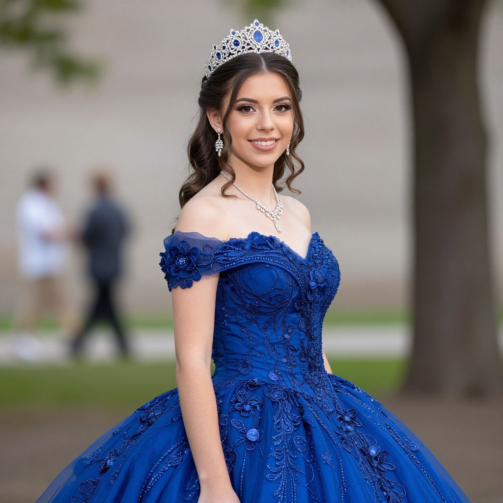 Photograph of a young woman with long, wavy brown hair wearing a silver tiara and an off-shoulder, royal blue, intricately embroidered ball gown with a full skirt. She has fair skin, dark eyes, and is smiling. She wears silver drop earrings and a delicate necklace. The background is blurred, showing a tree and two indistinct people in casual clothing. The image has a soft focus, emphasizing the subject's elegant attire and poised demeanor. The overall style is formal, capturing a moment of regal beauty.