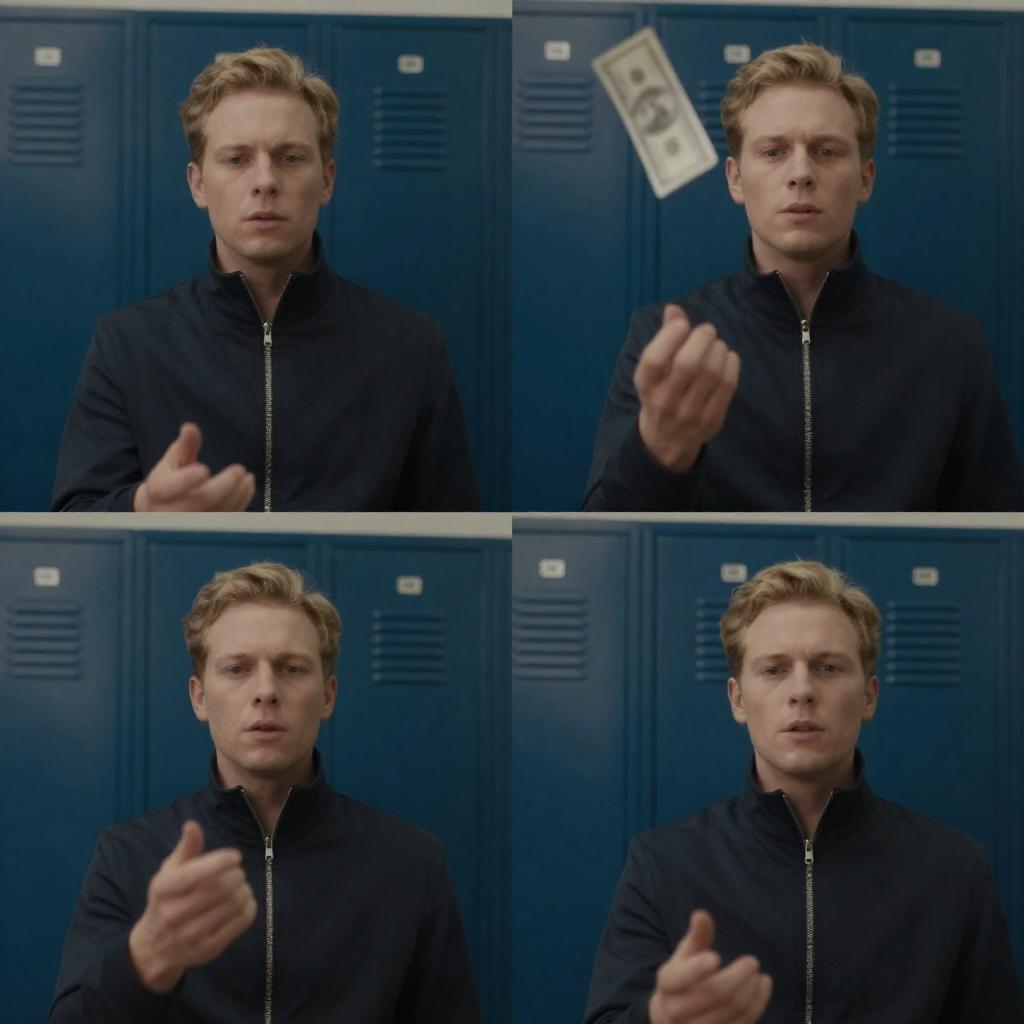 Photograph of a young, fair-skinned man with short blonde hair, wearing a dark zip-up jacket, standing in front of blue lockers. He appears in four mirrored panels. His expression is intense and focused. A stack of money is in mid-air in front of him. Lockers are blue with numbered locks.