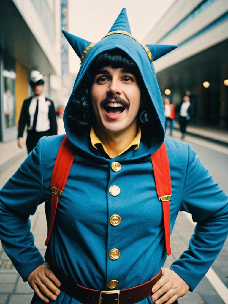 Person in Funny Fancy Dress Outfit, cinematic realism, humorous editorial cosplay shot
