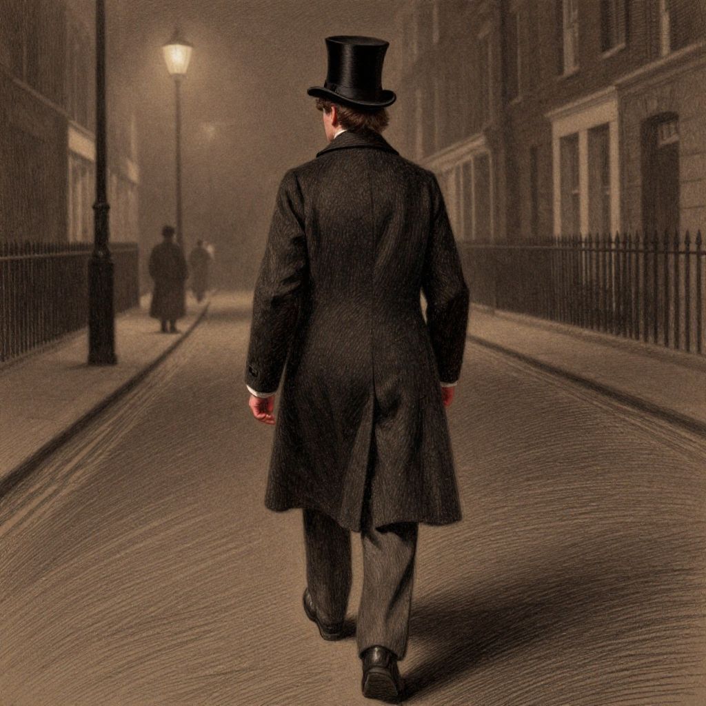 Ultra realistic full body color pencil drawn portrait of a man seen from behind, with a top hat and a a long coat, walking through a street of 1850 London, at night. Vibes of Charles Dickens.Deep dark intense brown foggy background, Dark theme, dynamic lighting, (soft shadows), (soft focus), (photo realistic), uhd, 8k