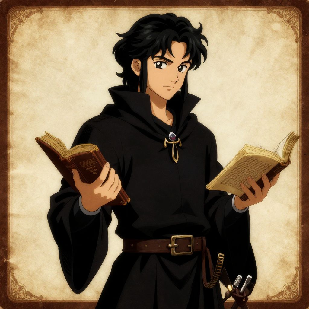 "Retro Music The Legend of Zelda Twilight Princess concept anime art, young man with black curly hair, black sorcerers robe, carrying an old spell book,"