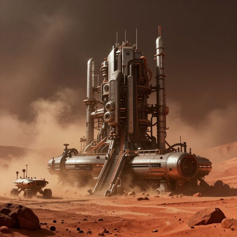 The image depicts a cyberpunk Mars base facility, characterized by a futuristic, dystopian aesthetic. The central structure is a complex, multi-tiered assemblage of metal and machinery, with various pipes, cables, and mechanical components interwoven throughout. The base is surrounded by a desolate, reddish-brown landscape, suggesting a harsh, alien environment. Dust and debris are scattered across the ground, adding to the post-apocalyptic atmosphere. In the background, a large dust storm obscures the sky, casting a dim, ominous light over the scene. To the left, a standing rover is visible, its form partially obscured by the dust. The overall composition is dynamic, with the central structure acting as a focal point, while the surrounding elements create a sense of depth and scale. The interplay of colors, textures, and shapes contributes to the intricate and detailed visual narrative of this futuristic, alien base.
