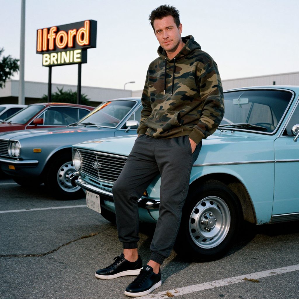 "a man, camo print hoodie, dark charcoal joggers, black leather trainers, street-ready look, neon-lit sign, cracked pavement, vintage cars parked, Ilford film stock, leaning against a vintage car, confident smile.Man has masculine face and piercing eyes"