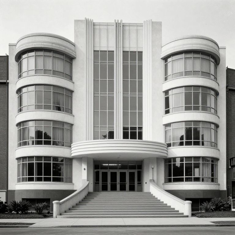 Art Deco-inspired facade of the House of Tomorrow by George Fred Keck (1933), featuring curved glass windows, clean white lines, and a prominent staircase leading to the entrance, captured by Kaufmann & Fabry Co., as part of the University of Illinois at Chicago Library's collection.