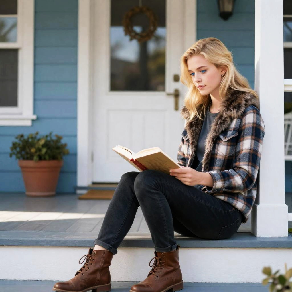 Blonde girl with blue eyes, wearing a plaid shirt, fur collar, dark pants, and brown boots, sitting on porch steps, reading a book. Background: blue house, white door with glass panels, white railings, potted plants. Sunlight, relaxed expression.