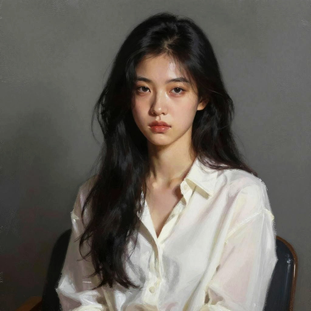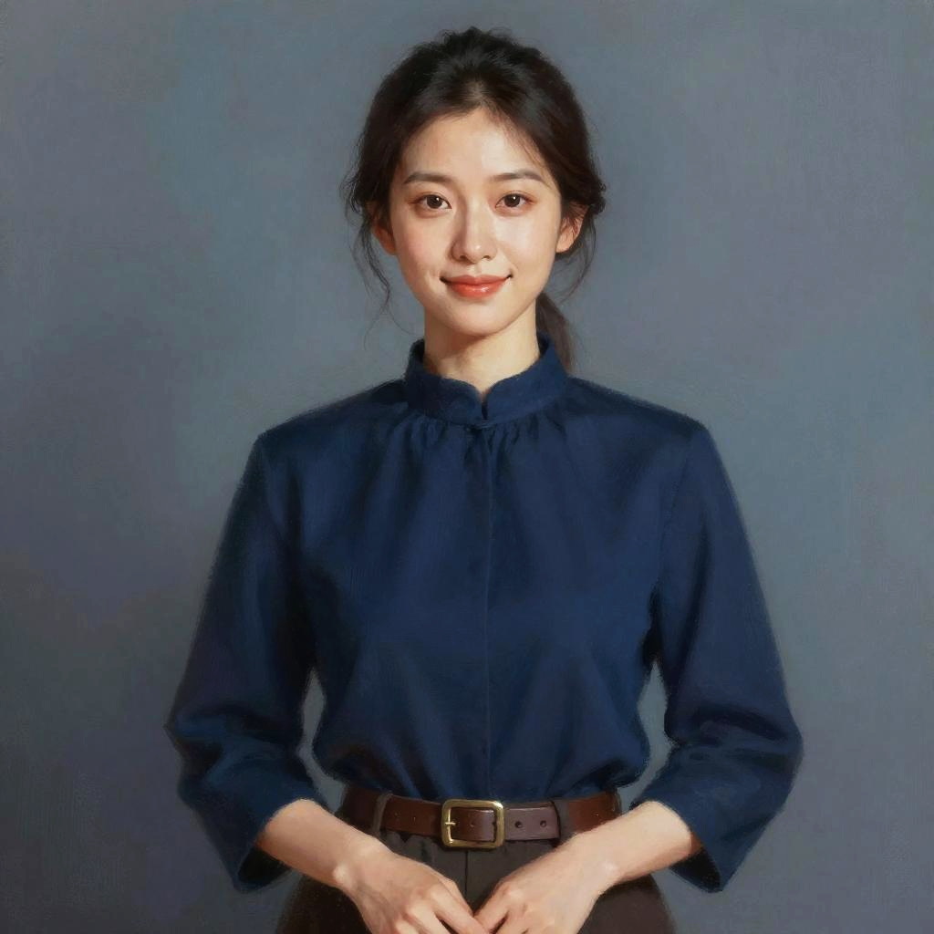 This is a digital painting of an Asian woman with fair skin and dark, wavy hair tied back. She's wearing a dark blue, long-sleeved blouse with a high collar and a brown belt. Her expression is gentle, with a slight smile. The background is a textured, grayish-blue. She stands with her hands lightly clasped in front of her. The style is realistic with a slightly impressionistic texture.