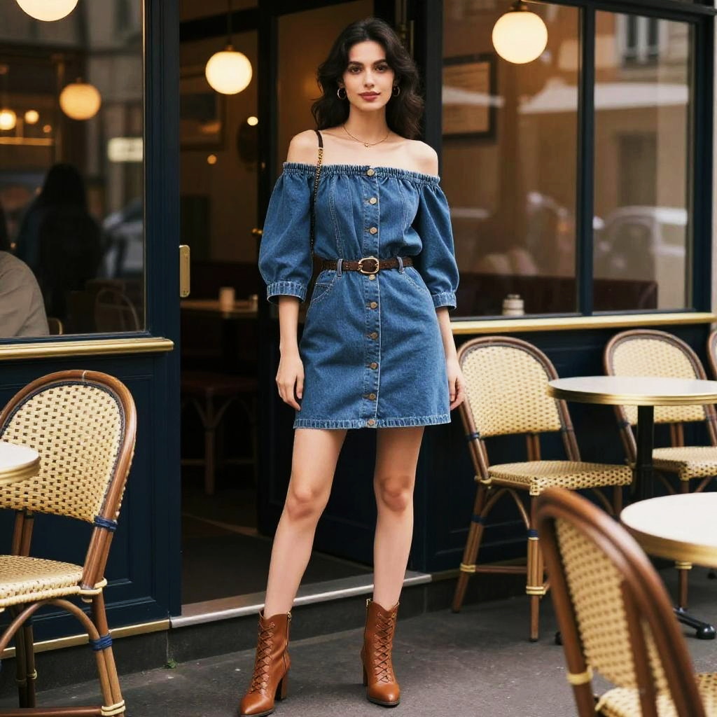 A petite woman in a casual chic denim off-the-shoulder dress with three-quarter sleeves and brown cut-out ankle boots stands at a trendy restaurant in Paris at night, illuminated by soft lights, capturing the essence of mappa studio's visual style. Sexy. Pretty face and beutiful eyes