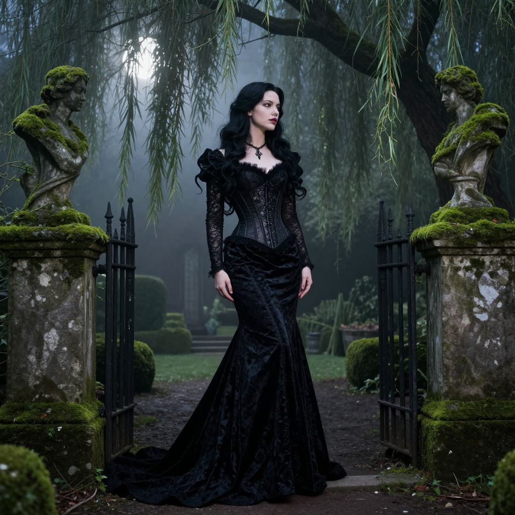 In a fog-drenched gothic garden with moss-covered statues and iron gates, a Gothic queen with long, elegant black hair and a hauntingly serene expression stands beneath a weeping willow, her silhouette outlined by moonlight, wearing a lavish black lace corset and long gown that drapes like velvet shadows, radiating an aura of mysterious beauty and dark sophistication.
