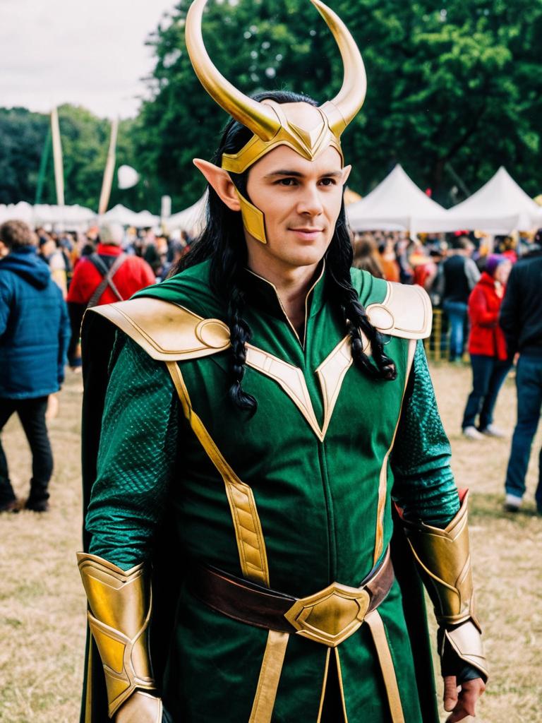 Man in Loki Classic Costume, candid cosplay portrait at festival