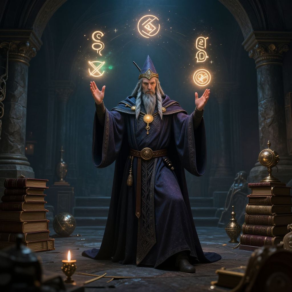 Photorealistic image of a bearded wizard in a blue robe, holding glowing magical symbols, surrounded by books and candles in a dimly lit,