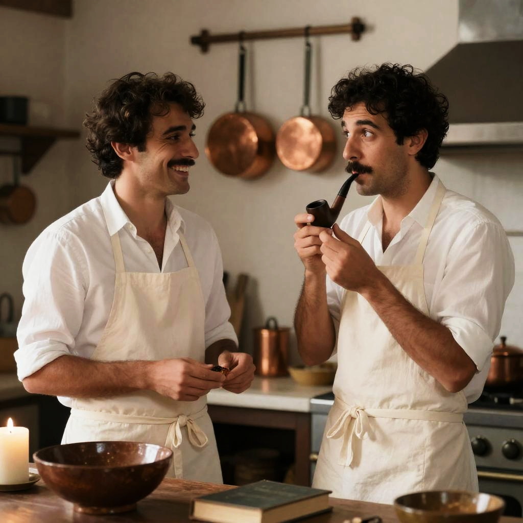 Photograph of two people. Man with dark curly hair, mustache, light brown shirt, dark vest, holding a small object. Woman with curly brown hair, gray knit hat, brown coat, blue scarf, smoking a pipe, looking at the object. Dark background. Man focused, woman attentive.