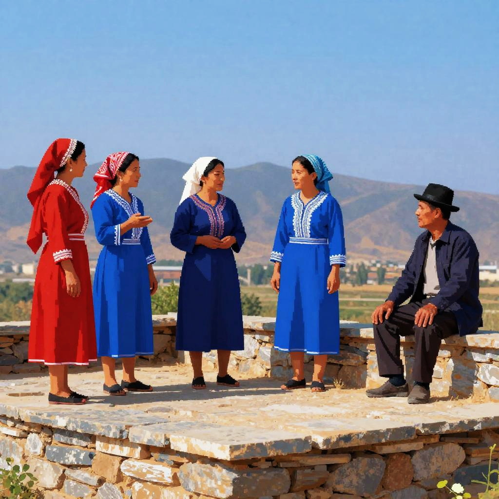 This is a colorful, slightly pixelated photograph of a rural scene featuring five people in traditional clothing. Four women in red and blue dresses, with headscarves, are standing on a sunlit stone terrace, talking and gesturing. A man in a dark shirt and hat, sitting on the right, watches them. The background shows a bright, blue sky and distant, hazy mountains. The stone terrace has a rustic, weathered texture.