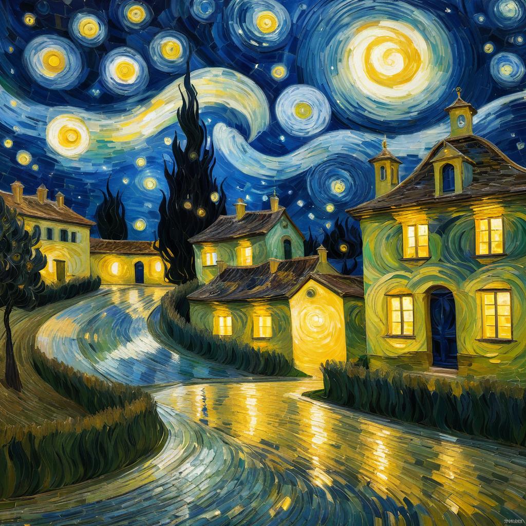 A detailed painting inspired by Vincent van Gogh's Starry Night, depicting a quiet village under a swirling, luminous night sky. The artwork features Renaissance-style lighting with glowing windows and reflective paths, highlighting the combination of post-impressionist and classical elements.