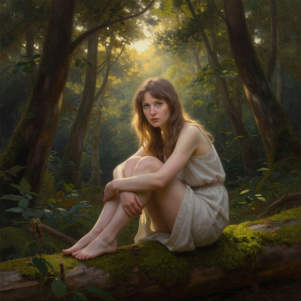 Photorealistic digital painting of a young woman with long, wavy brown hair and fair skin, sitting barefoot on a moss-covered log in a dense forest. She wears a loose, white, sleeveless dress and has a contemplative expression. Sunlight filters through the tall trees, creating a dappled light effect on her and the surrounding foliage. Her knees are drawn up to her chest, and her arms rest on top of her knees, with her hands clasped. The background is rich with greenery and shadows, enhancing the serene, mystical atmosphere.