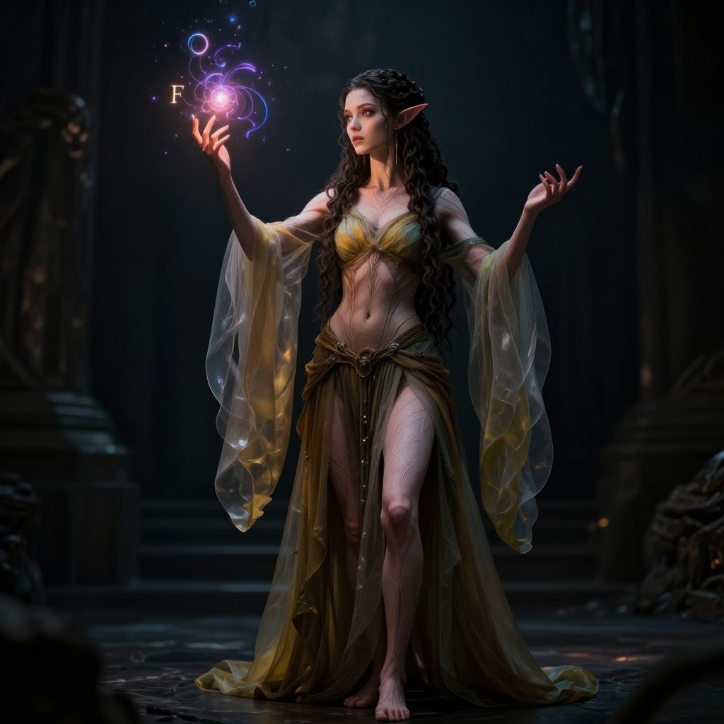 Photorealistic digital art of a dark-haired, pale-skinned elf woman standing in a dimly lit, ancient stone corridor. She wears a gold, strapless top with a translucent, flowing yellow and brown skirt. Her pointy ears and long, wavy hair are prominent. She holds a glowing, purple crystal orb with floating letters "P" and "F" above it in her raised right hand. Her left hand is outstretched to the side. The texture of her outfit is sheer and ethereal, contrasting with the rough stone background. The lighting emphasizes her mystical aura.
