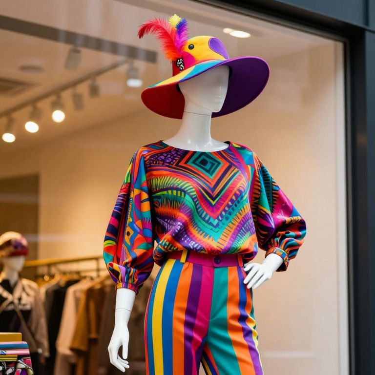 A detailed mannequin standing in a vibrant, modern storefront, wearing a colorful outfit featuring bright striped pants and a bold, patterned top. The mannequin dons a large, eye-catching colorful hat with a vibrant feather on top, adding a playful and lively touch. The setting is illuminated by soft, warm lights, enhancing the vivid hues of the outfit and creating a dynamic, festive atmosphere. The mannequin has a sleek, polished appearance with realistic fabric textures, and its pose is slightly tilted to one side, giving it a sense of movement and charm.
