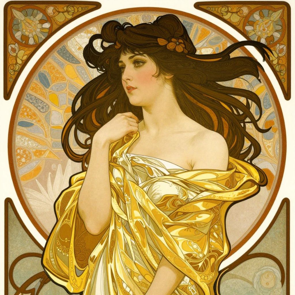 A vibrant Art Nouveau-style illustration featuring a woman with flowing black hair and a golden shawl, exuding elegance against a richly ornate circular frame, evoking the timeless allure of Alphonse Mucha's aesthetic.