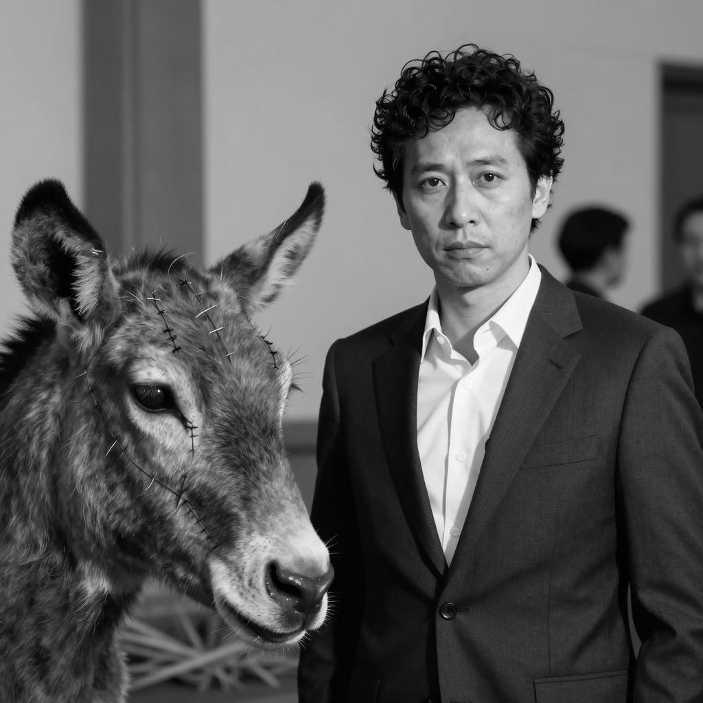 A man with shoulder-length dark hair, glasses, and a light gray t-shirt sitting on a floral-patterned couch. His hands are clasped in front of him. To his right, a black monkey with a white patch on its chest is sitting upright. The background includes a dark room with a white pillar and various objects on a shelf. The man has a neutral expression, and the monkey looks slightly to the right. Two people, one human and one monkey, are present.