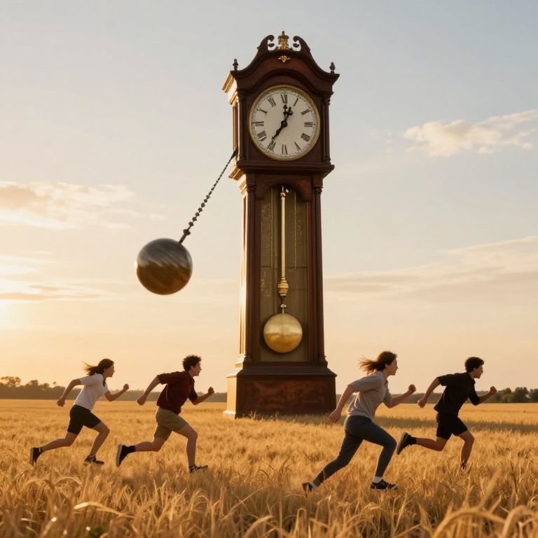 People sprint frantically across a golden field as a towering grandfather clock, defying gravity and reason, looms ominously behind them, its pendulum swinging wildly against the backdrop of a serene sunset.