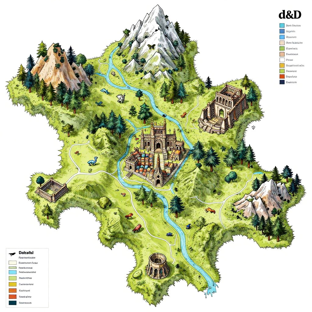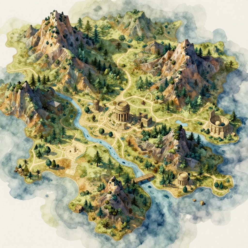 Highly detailed AI generated maps depicting fantasy landscapes with mountains, rivers, forests, and ancient ruins, rendered in a watercolor style with subtle textures and mystical hues, blending realism and imagination seamlessly.