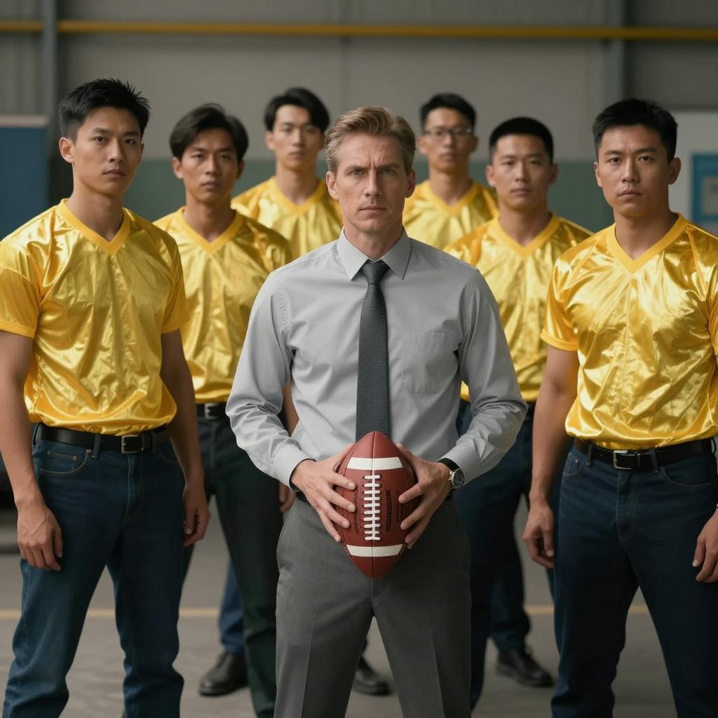 Photograph of a group of six men. Central man in grey shirt and tie holds football, flanked by five men in shiny yellow jerseys. Background: dimly lit industrial setting. Central man's hands on hips, others stand with neutral expressions.