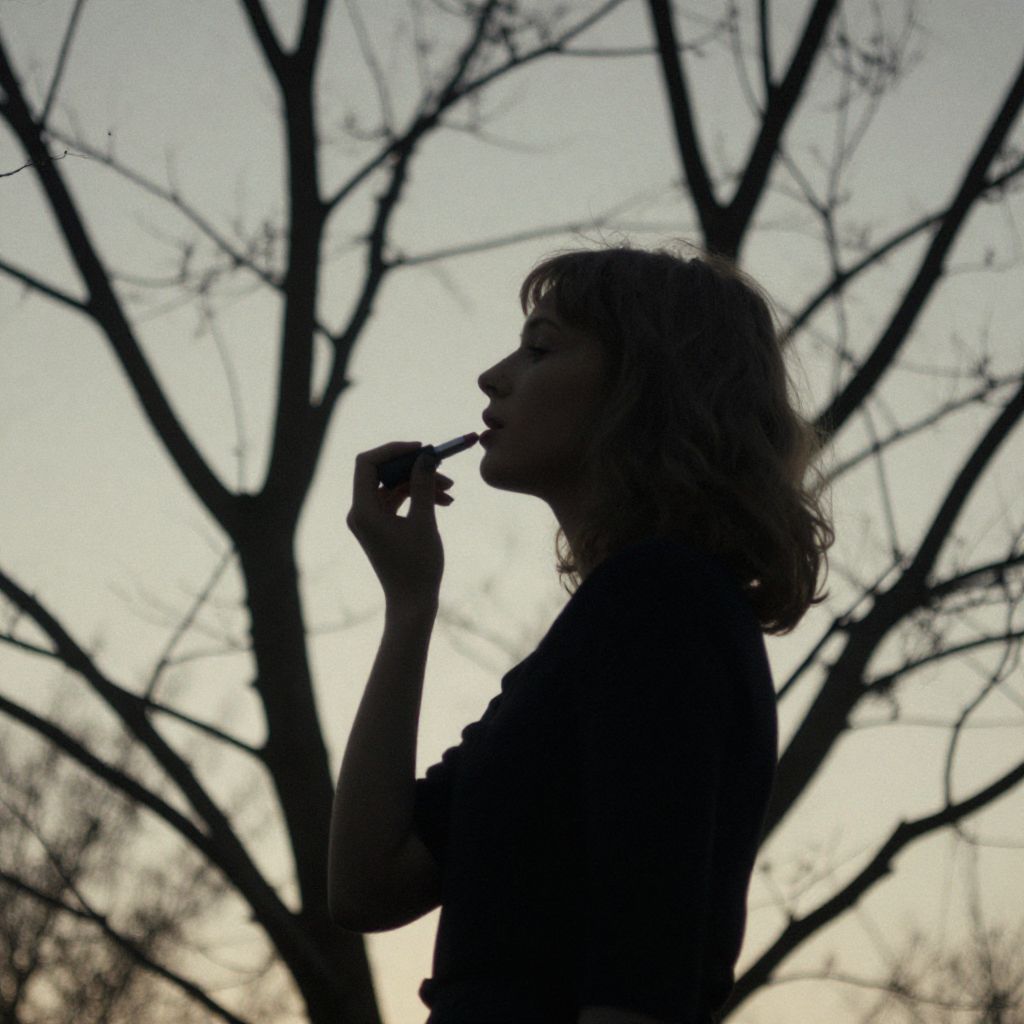 Photograph of a silhouetted woman with wavy, shoulder-length hair, standing in profile against a backdrop of leafless trees. She is holding a cigarette to her lips with her right hand, her profile highlighted in dark shadow. The background features a pale, early evening sky with the tree branches creating a web-like pattern. The woman's silhouette is black, contrasting sharply with the lighter sky and tree branches. She wears a dark, indistinct top, and the overall mood is moody and contemplative.