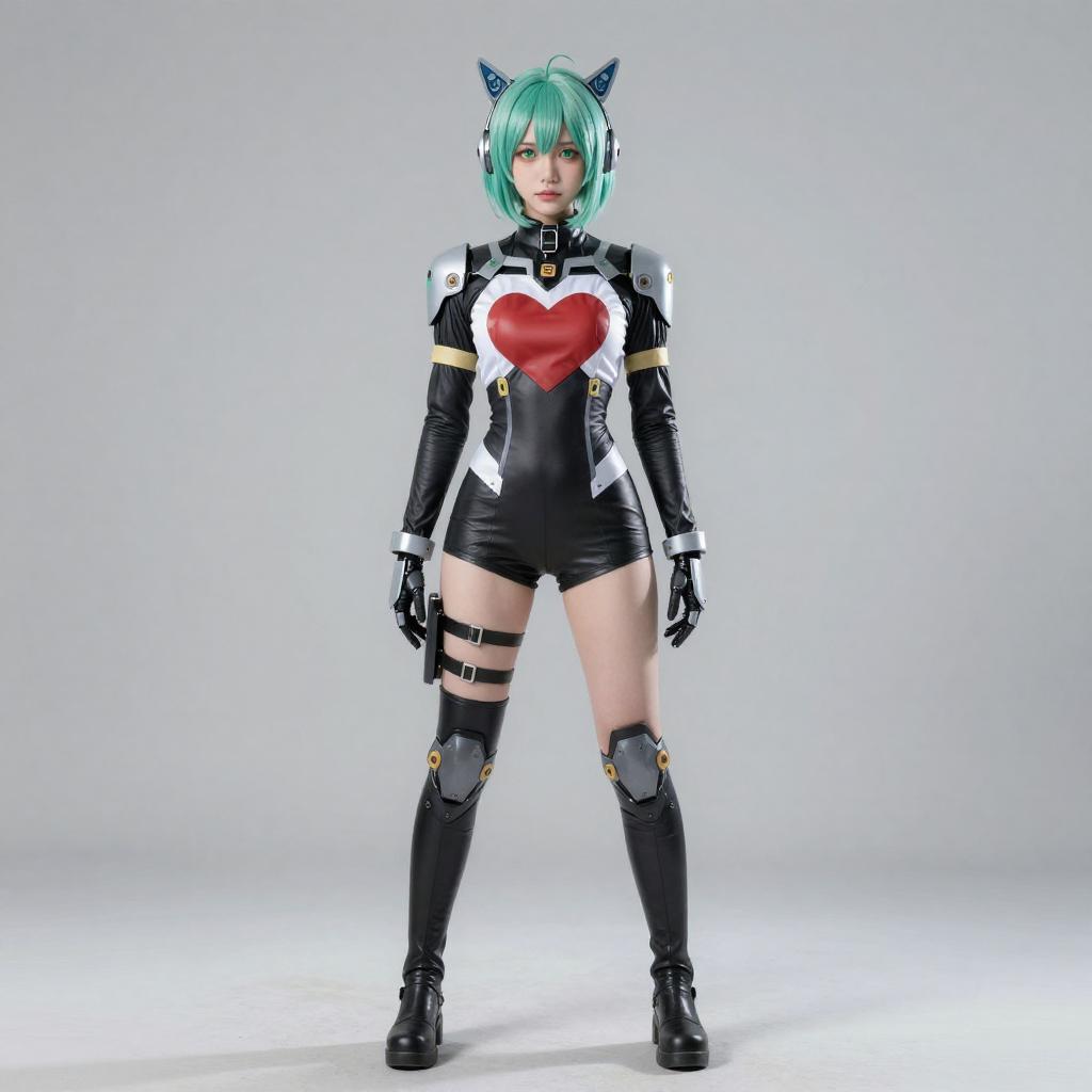 Full-body, photo-realistic cosplay of a female android character with short green hair and robot cat ears. She wears a sleek black and white bodysuit featuring a large red heart on the chest, long sleeves, metallic shoulder pads, and black knee-high boots with mechanical details. The subject has green eyes and stands confidently against a plain gray background in a professional studio photoshoot.
