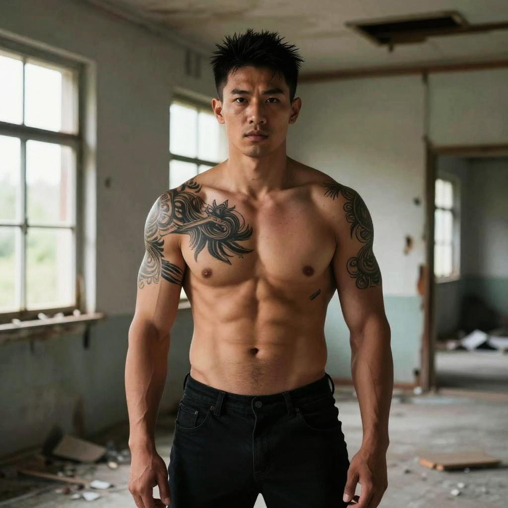 Photograph of a shirtless, muscular Asian man with black spiky hair and detailed tattoos on his left shoulder and chest, standing in a dilapid